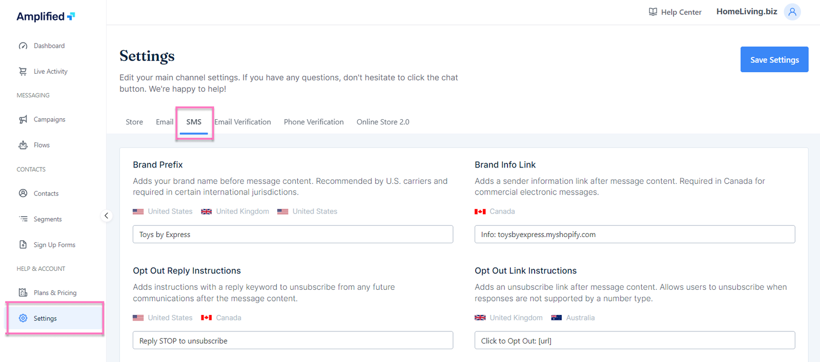 How to check your SMS compliance 💡Changing the brand prefix, brand info link, and opt-out link/reply instructions can be done in the Settings page, SMS tab.