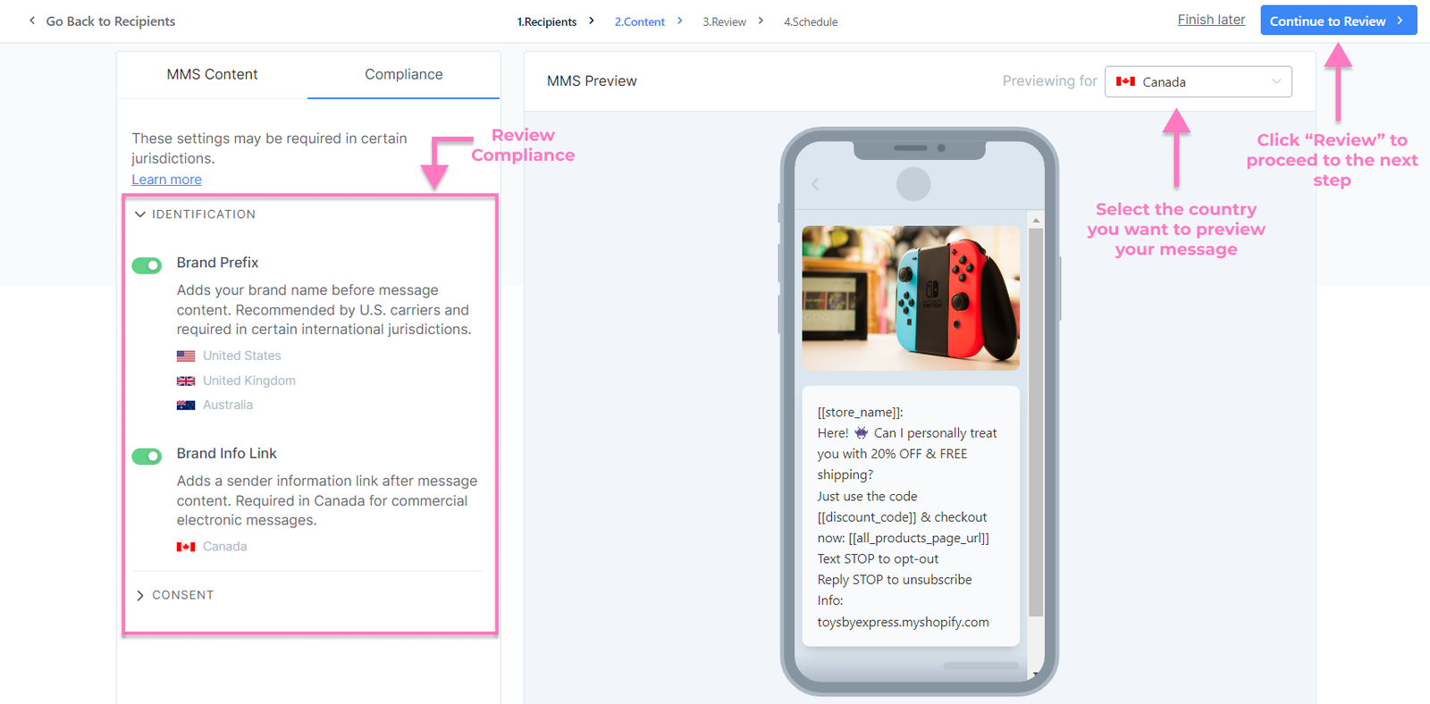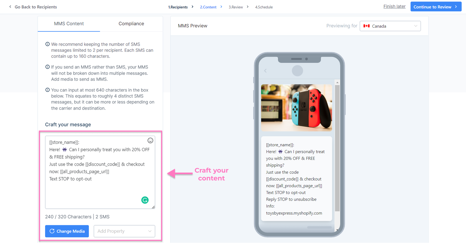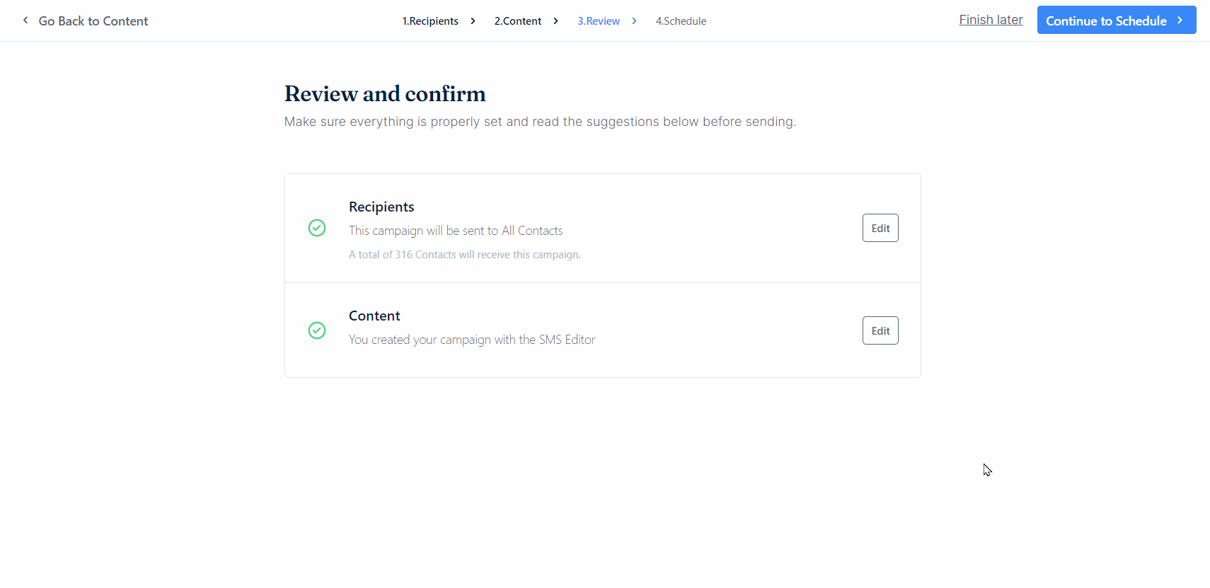 - Review and confirm your content. Click Continue to Schedule when done.