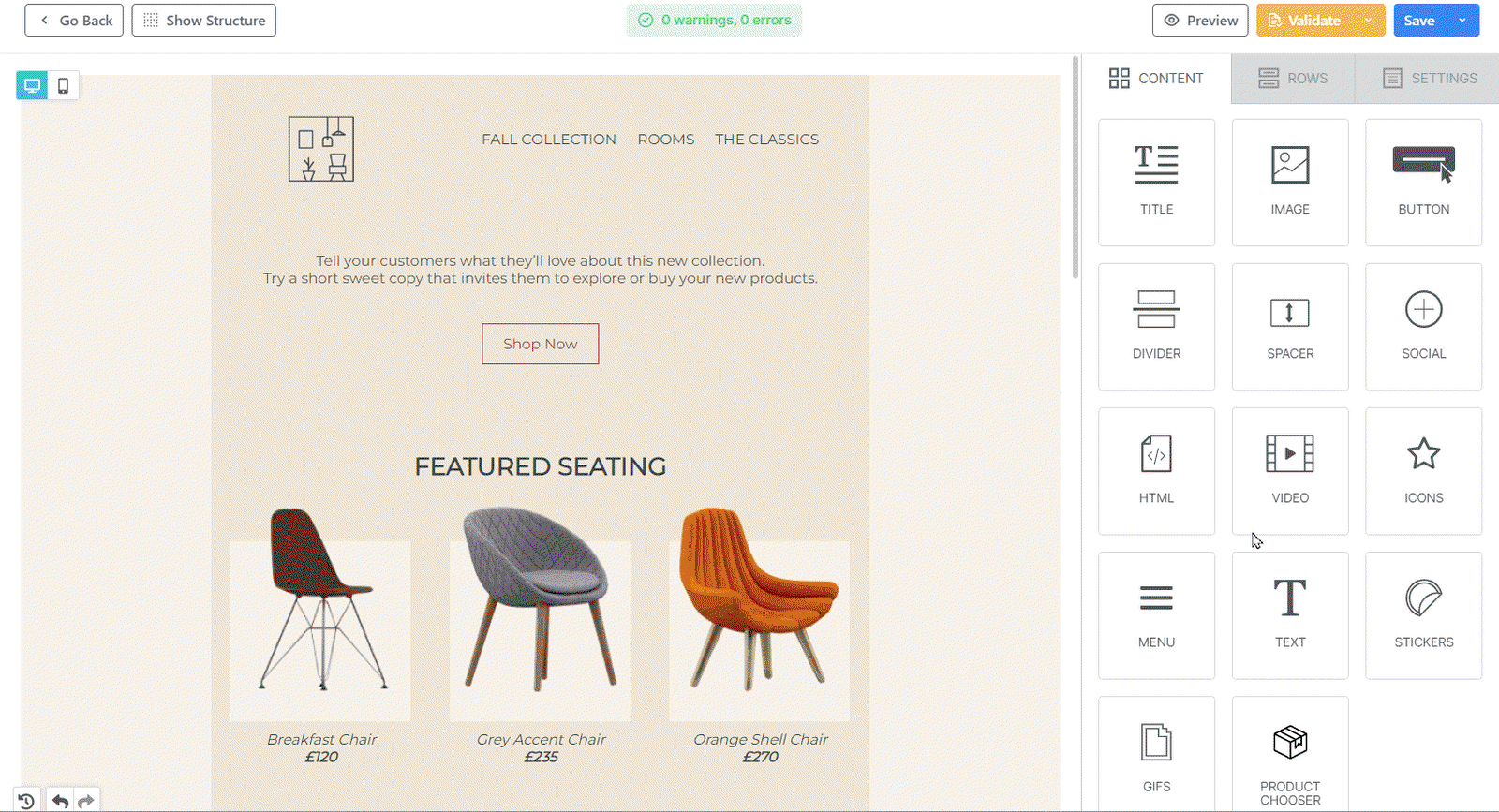 - Once done selecting, click “Insert Product”. This will add the item's image, name, and price to your email, along with a “Shop Now” button. When clicked, this button will take your customer directly to the item on your website.