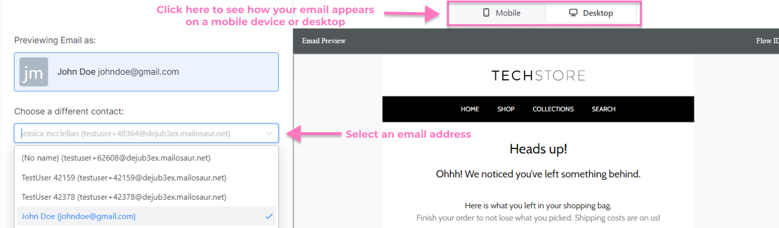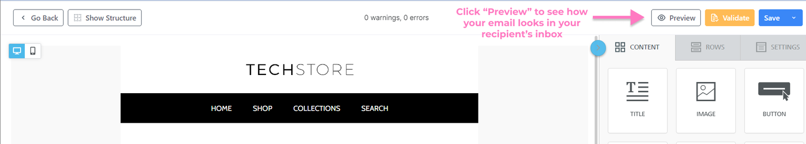 Click “Desktop” to see how your email looks on a desktop or laptop, and “Mobile” to see how it appears on a mobile device.